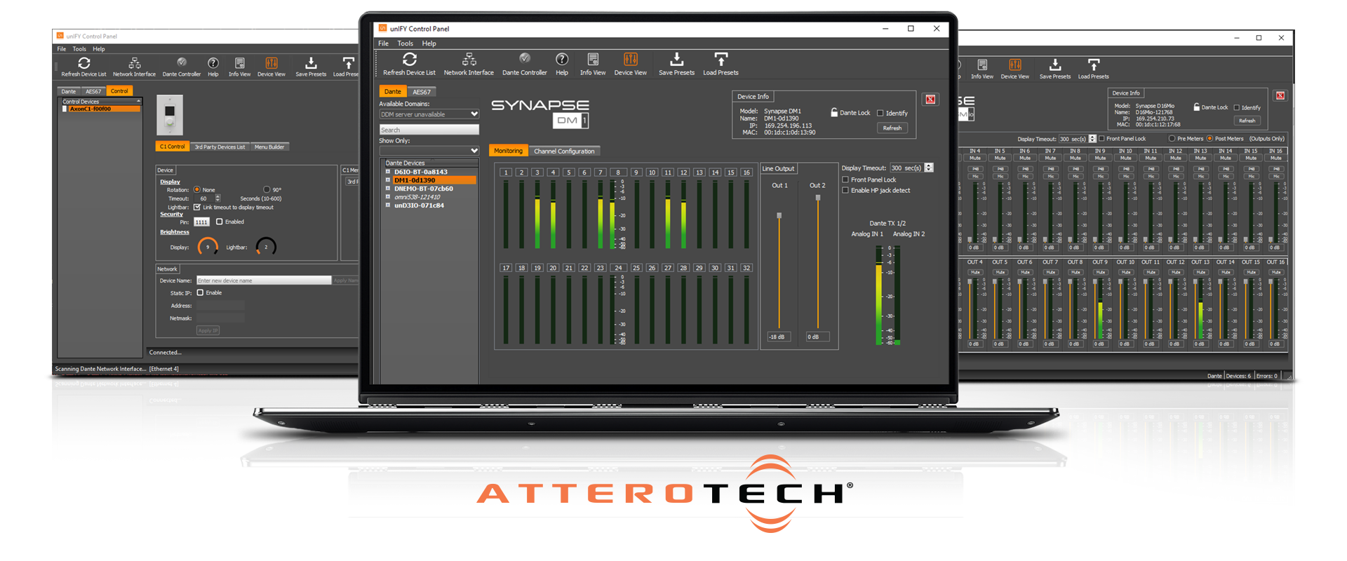 unIFY Control Panel software provides users with a simple tool to monitor and configure Attero Tech devices. It detects connected devices on the configured network automatically showing them in a device list. Once a device is discovered, unIFY can present further details about the device. For Attero Tech devices, unIFY is also used to configure the device settings such as gain and phantom power.
